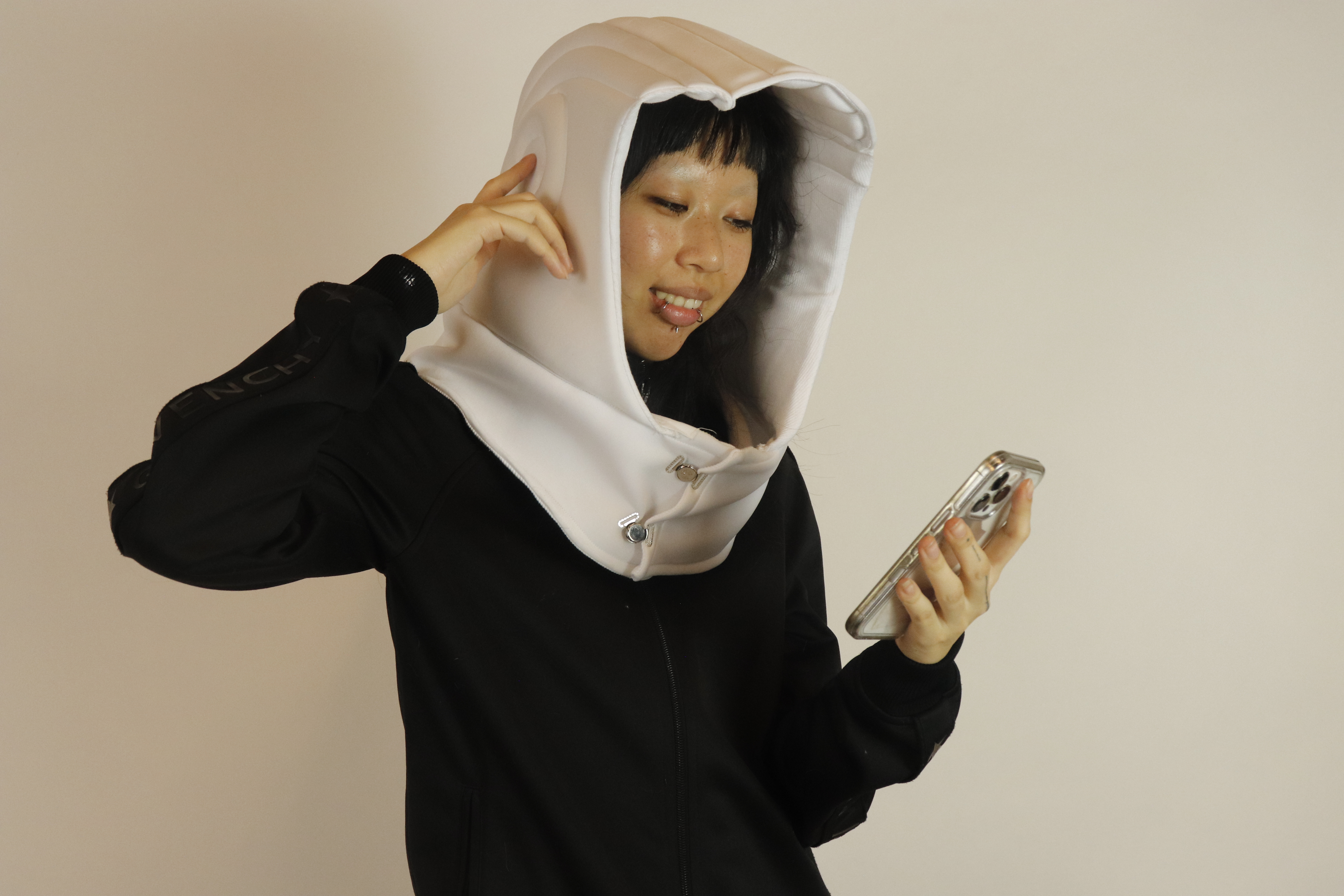 DOME is made of comfortable soft ribbed fabric on the inside and smooth neoprene on the outside, resulting in a cozy but sleek accessory that is easily donned and doffed. It features pockets for compact sound systems to facilitate easy access for pairing from the outside and a foam core that enables sound insulation, creating a portable, three-dimensional sound experience. It also includes magnetic metal clasps as a closure mechanism.